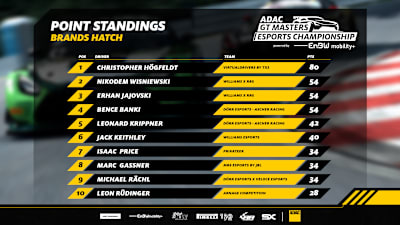 Direkte Verfolger von Högfeldt in der Gesamtwertung sind Bence Bánki (Dörr Esports), Erhan Jajovski und Nikodem Wisniewski (Williams Esports), die alle mit 54 Punkten auf dem Plätzen zwei bis vier liegen. „Ich hatte in den Qualifyings kein Glück und bin dementsprechend aggressiv gestartet“, berichtet Bánki. „Das war meine einzige Chance noch Plätze gutzumachen, da man in Brands Hatch nur schwer überholen kann. Ich weiß, dass ich nicht der schnellste im Feld bin, aber ich fahre sehr konstant und darauf setzte ich in dieser Saison.“