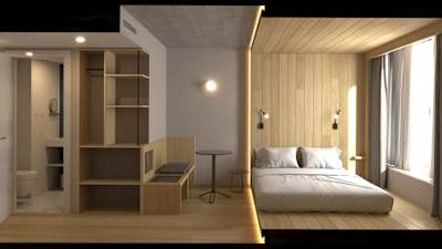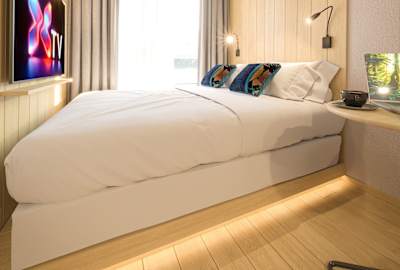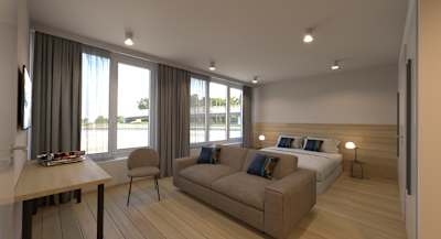Diese Option ist eine Stufe über dem gewöhnlichen Hotelzimmer und bietet eine hervorragende Raumausnutzung auf 18 m². Sie verfügt über einen erhöhten Schlafbereich mit bequemer Bettwäsche, einen Smart-TV und eine große Fensterfront, die den Raum mit natürlichem Tageslicht durchflutet.