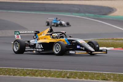 Im ersten Rennen am Samstagvormittag sahen die Besucher des ADAC Racing Weekend in der Eifel ein kurzweiliges Rennen. Bei bewölktem Himmel und Temperaturen von zwölf Grad Celsius gingen die Piloten mit ihren rund 180 PS starken Formel-4-Fahrzeugen auf Regenreifen an den Start. Pole-Setter Camara verteidigte auf der nassen Strecke seine Führung vor Antonelli. Allerdings neutralisierte eine Safety-Car-Phase in der achten Runde das Feld. Camara bestimmte zwei Umläufe später wieder das Tempo und behauptete beim Re-Start seine Führung. Eine Runde auf der 5,137 Kilometer langen Grand-Prix-Strecke später setzte Antonelli zum entscheidenden Manöver an: Über mehrere Kurven hinweg duellierte sich der Mercedes-Junior mit dem Ferrari Driver Academy-Piloten und übernahm Platz eins. Damit machte der Meisterschaftsführende Antonelli einen weiteren Schritt in Richtung Titel und kam vor Camara ins Ziel. Der Australier James Wharton (16/Prema Racing) komplettierte das Podium. Durch seinen vierten Platz hielt Barnard das Titelrennen zunächst noch offen, Ugochukwu wurde Fünfter.