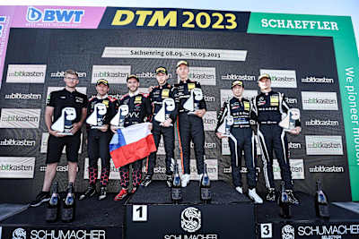 Im Kampf um Platz zwei lieferten sich Hites und Valente in den letzten Runden des 60-minütigen Sprintrennens ein packendes Duell. Nürburgring-Sieger Hites behielt die Oberhand und überquerte etwas mehr als drei Zehntelsekunden vor Valente die Ziellinie. „Ich erlebte eine regelrechte Zitterpartie. Meine Hinterreifen bereiteten mir Probleme und bauten im Rennverlauf immer mehr ab. Deshalb entschied ich mich für eine konservative Herangehensweise und habe die Curbs gemieden. Ich bin erleichtert, dass es für Platz zwei gereicht hat“, sagte Hites. Mit Rang drei gelang Valente und Aron der zweite Podiums-Erfolg nach dem fünften Saisonrennen am Nürburgring. „Beim Start sind wir von Platz zwei auf Rang fünf zurückgefallen. Wir trafen die Entscheidung, früh die Box anzusteuern und einen Undercut zu machen. Später schaltete das Auto bei einem Überholmanöver plötzlich in den neutralen Gang und ich verlor wieder Plätze. Davon ließ ich mich nicht aus der Ruhe bringen und konnte mit Platz drei das Maximum herausholen“, fasste Valente zusammen.