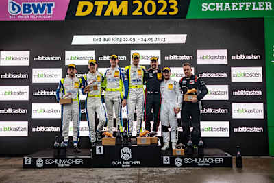 Im Kampf um den zweiten Platz entwickelte sich schon früh ein mitreißender Zweikampf zwischen Ellis und Müller. In der Schlussphase übte Gehrsitz, der das Cockpit von Müller übernahm, großen Druck auf den Mercedes-AMG-Piloten Umbrarescu aus und eroberte sich mit einem spektakulären Überholmanöver den Silberrang. „Sven überreichte mir das Steuer als Dritter. Das Rennende rückte immer näher und mir lief die Zeit davon. Da wir um die Meisterschaft kämpfen, habe ich es einfach probiert und musste beim Überholmanöver großes Risiko eingehen“, erklärte Gehrsitz, der auch die Pirelli-Junior-Wertung gewann. Mit dem dritten Platz freuten sich Umbrarescu und Ellis über Pokale bei der Siegerehrung. „Schön, wieder im ADAC GT Masters zu starten. Zu Beginn des Rennens boten wir mit vielen Duellen mega Racing. Die schwierigen Bedingungen lagen dem Mercedes-AMG. Toll, dass wir unsere Leistung mit Rang drei belohnen konnten“, äußerte sich der zweimalige ADAC GT Masters-Rennsieger Ellis.
