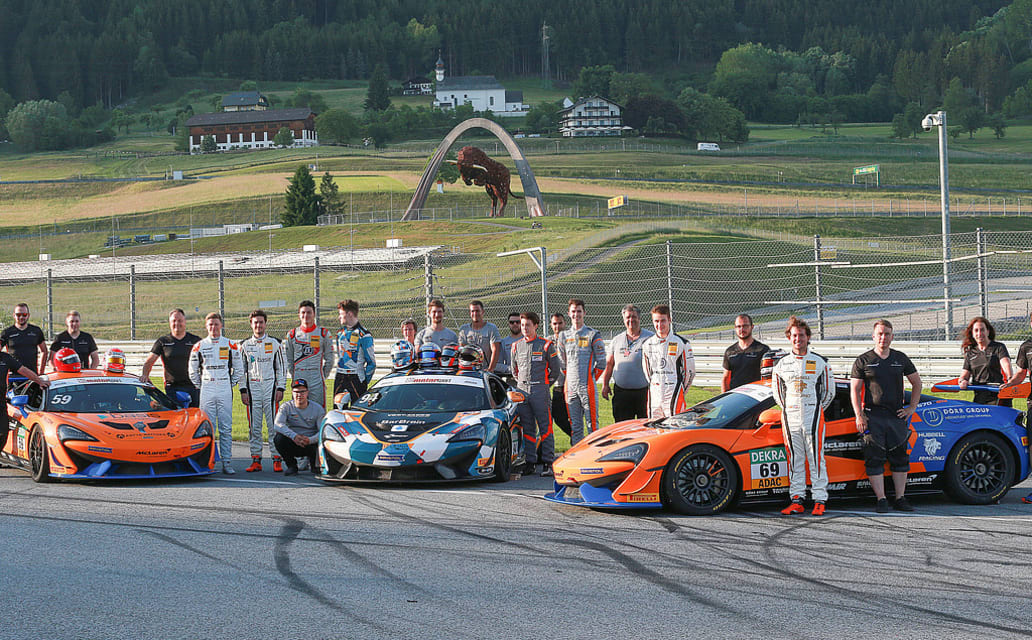 Gut positioniert: Am Donnerstagabend initiierte Dörr Motorsport ein Gruppenbild in Kurve eins. Daran nahm auch Konkurrent 'Team GT' teil. Beide Rennställe treten 2019 mit dem McLaren 570S GT4 in der ADAC GT4 Germany an. "Wir sind seit Ende des letzten Jahres offizieller Händler für McLaren Customer Racing. In diesem Zusammenhang übernehmen wir für die GT-Rennwagen des britischen Herstellers den kompletten Vertrieb und die Ersatzteilversorgung in Deutschland. Aber natürlich können auch Teams aus Österreich einen McLaren von uns bekommen. Das betrifft sowohl das GT3- als auch das GT4-Modell", erklärt Teamchef Rainer Dörr den Hintergedanken für das gemeinsame Foto.