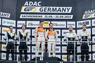 Hugo Sasse (18/Aschersleben) und Mike David Ortmann (22/Ahrensfelde, beide Prosport Racing) sind die Dominatoren des Rennwochenendes der ADAC GT4 Germany auf dem Sachsenring. Das Duo im Aston Martin Vantage GT4 konnte nach dem Triumph im Samstagsrennen auch Lauf zwei am Sonntag für sich entscheiden und somit vor dem Finale die Tabellenführung auf 20 Punkte ausbauen. Ihre Markenkollegen Ben Dörr (17/Butzbach) und Romain Leroux (19/FRA, beide Dörr Motorsport) sowie Indy Dontje (29/NLD) und Phil Dörr (21/Butzbach, beide Dörr Motorsport) komplettierten das Podium. Diese drei Paarungen liegen auch in der Meisterschaftswertung auf den ersten drei Plätzen. Das verspricht Hochspannung für das Saisonfinale in vier Wochen auf dem Hockenheimring. „Zwei Siege, die Pole-Position gestern und die Tabellenführung. Besser hätte das Wochenende eigentlich nicht laufen können. Mir fehlen einfach nur die Worte. Ich bin überglücklich“, strahlte Ortmann mit dem Siegerpokal in den Händen.