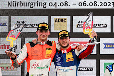 Nach Platz zwei am Samstag gewannen Hugo Sasse (19/Aschersleben) und Mike David Ortmann (23/Ahrensfelde, beide Prosport Racing) im Aston Martin Vantage GT4 das Sonntagsrennen der ADAC GT4 Germany auf dem Nürburgring. Die amtierenden Champions machten damit einen großen Schritt in Richtung Titelverteidigung und reisten als neue Tabellenführer aus der Eifel ab. Zur Saisonhalbzeit der ADAC GT4 Germany ist ihnen zudem der inoffizielle Titel des Halbzeitmeisters sicher. Rang zwei im Sonntagsrennen ging an das Porsche 718 Cayman GT4-Duo Daniel Gregor (17/Maikammer) und Finn Zulauf (19/Königstein im Taunus, beide AVIA W&S Motorsport) vor den Vortagssiegern Jan Philipp Springob (22/Olpe) und Simon Primm (18/Großschirma, beide CV Performance Group) im Mercedes-AMG GT4. „Wir freuen uns natürlich riesig über den Sieg, zumal der Nürburgring auch das Heimspiel unseres Teams ist. Gerade das Rennen zur Saisonhalbzeit hat in der Regel Signalwirkung für den Rest der Jahres. Insofern fahren wir optimistisch an den Lausitzring in zwei Wochen“, jubelte Sasse auf dem Podium.