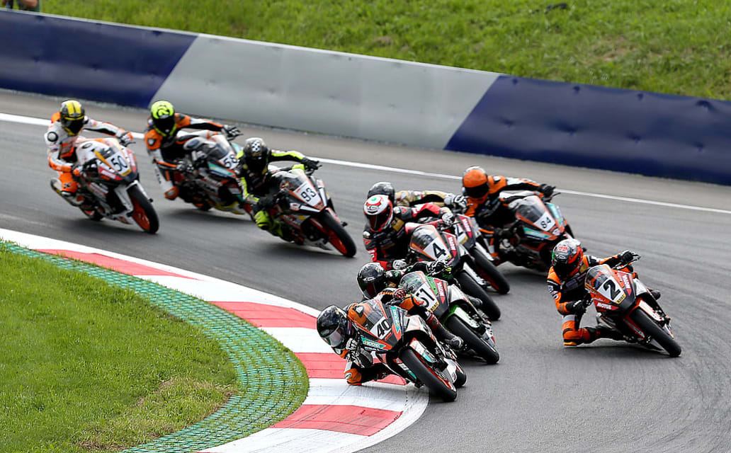 Nach dem ersten mitreißenden Rennen im Rahmen des Motorrad Grand Prix von Österreich, legten die Piloten des ADAC Junior Cup powered by KTM am Sonntagnachmittag im zweiten Lauf auf dem Red Bull Ring in Sachen Spannung noch einmal zu. 25 Fahrer kämpften vom Start bis ins Ziel um die besten Plätze. Dabei wechselten sie die Positionen in fast jeder Kurve. Schließlich konnte sich Gaststarter Finn de Bruin (15, NED) im Kampf um den Sieg durchsetzen.