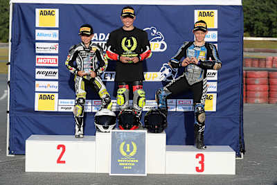 Till Trinks (1./1., Meerane): „Mit zwei Stürzen in den freien Trainings lief es am Freitag noch nicht gut. Samstag ging es dann wieder nach vorn. Im ersten Rennen war es etwas regnerisch. Ich habe Geschwindigkeit herausgenommen und im Verlauf des Rennens wieder gesteigert. So konnte ich Jamie (Loth) überholen und das Rennen gewinnen. Beim zweiten Rennen war ich nach dem Start wieder zweiter, konnte Jamie aber in der dritten Kurve überholen und das Rennen ebenfalls gewinnen. Ich freue mich, dass ich heute schon die Meisterschaft gewonnen habe. Ich danke der Motorrace Academy die mich im Winter so gut trainiert haben. Ein weiteres Dankeschön geht an die Familie Orgis die in Mülsen immer mit mir trainieren. In Schlüsselfeld werde ich wieder angreifen.“