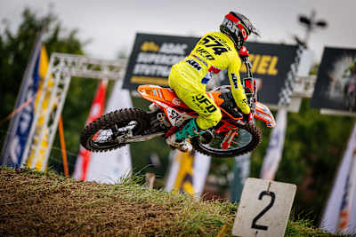 Der Kampfgeist des verletzungsgeplagten Jordi Tixier wurde am Samstag in Gaildorf mit dem Laufsieg im ersten Rennen belohnt. Der Franzose bewies als LS2 Best Qualifier bereits am Vormittag seine Stärke auf der Hartbodenstrecke. Die Pole-Position münzte er in einen Start in den Top-Drei um und übernahm nach dem ersten Renndrittel die Führung von Noah Ludwig (D/KTM Sarholz Racing Team), der zuvor Marcel Stauffer (A/Osicka MX Team) von der Spitze verdrängt hatte. Eine Runde später übernahm Tom Koch (D/Kosak Racing Team) den zweiten Platz und versuchte den Abstand zu Tixier zu verkürzen. Doch der Franzose kontrollierte die Spitze bis ins Ziel und gewann vor Koch, Ludwig, Adam Sterry (GB/Schmicker Racing) und Tabellenführer Max Nagl (D/KMP-Honda-Racing powered by Krettek), der in der ersten Runde gestürzt war.