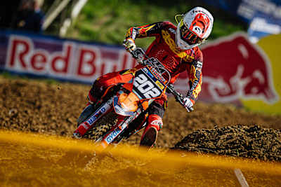 Maxime Grau erlebte einen perfekten Samstag. Zunächst sicherte er sich als Acerbis Best Qualifier die Pole-Position und verwandelte diese im Rennen sofort in den Red-Bull-Holeshot vor Valentin Kees (D/Kosak Racing Team), Manuel Carreras (E/KMP-Honda-Racing powered by DVAG) und Liam Owens (AU/Cat Moto Bauerschmidt Husqvarna). Carreras stürzte in der Startrunde und fiel ins Mittelfeld zurück. Meisterschaftsleader Mads Fredsoe (DK/Cat Moto Bauerschmidt Husqvarna) und Nico Greutmann (CH/Cat Moto Bauerschmidt Husqvarna) rückten dadurch in die Top Fünf auf. Die Spitzengruppe blieb lange dicht beisammen, nur Fredsoe verlor in der zweiten Rennhälfte Platz um Platz und fiel hinter Lyonel Reichl (LIE/KTM Sarholz Racing Team) auf Rang sechs zurück. In der Schlussphase wurde es hinter Grau eng: Kees verteidigte den zweiten Platz knapp gegen Owens und sorgte für Jubel bei den deutschen Fans.