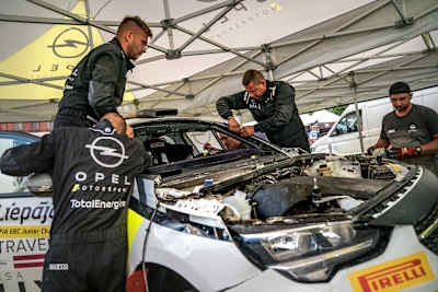 Zunächst hatte das Gastspiel der europäischen Rallye-Elite rund um die Ostsee-Hafenstadt Liepāja für die Franzosen sehr erfreulich begonnen. Mit Bestzeiten in den ersten zwei Wertungsprüfungen hatten sich Pellier/Pelamourgues an die Spitze des mit 13 Rally4-Fahrzeugen sehr stark besetzten Junior-EM-Feldes gesetzt. In WP3 indessen folgte ein Dämpfer in Form eines Überschlags, den die Besatzung dank des ausgeklügelten Sicherheitskonzepts des Corsa Rally4 unversehrt überstand. Pellier brachte seinen havarierten Renner aus eigener Kraft zurück in den Servicepark und (wenn auch bei Regen und Kälte ohne Windschutzscheibe) durch die letzten drei Wertungsprüfungen des Tages, der Rückstand auf die Spitze nach der ersten Etappe fiel mit einer guten Viertelstunde allerdings sehr deutlich aus.