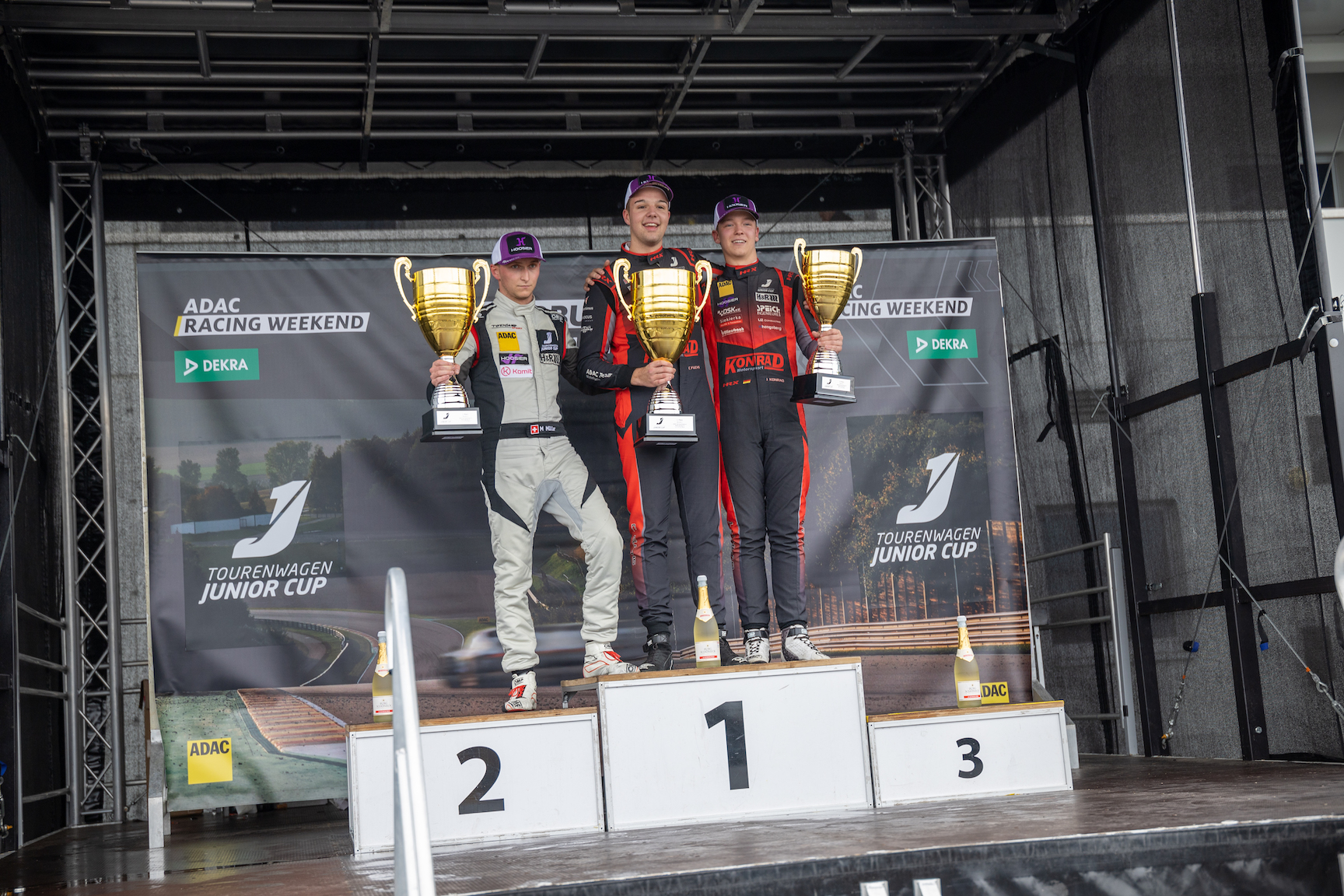 Im ADAC Tourenwagen Junior Cup, in dem alle Piloten einen einheitlichen VW up! GTI steuern, war die Ausgangslage im Titelrennen besonders eng, denn Cedric Fuchs reiste mit gerade einmal einem Zähler vor Mike Müller in die Eifel. Fuchs war sich des knappen Vorsprungs durchaus bewusst, denn er setzte sich am Start zum ersten Heat in Führung und gab diese nicht mehr aus den Händen. Sein härtester Titelrivale Müller musste sich mit Platz zwei vor Julian Konrad zufriedengeben. Am Sonntag konnte Fuchs sich schon früh vom Feld absetzen und seinen Vorsprung kontinuierlich ausbauen. Nach acht Runden war er fast sechs Sekunden vor Müller im Ziel und sicherte sich so den Titel im ADAC Tourenwagen Junior Cup. Rang drei im finalen Durchgang des Jahres holte sich Konrad.
