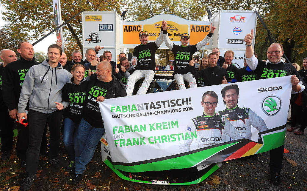Großer Jubel bei Škoda Auto Deutschland im Ziel der ADAC 3-Städte-Rallye (21. - 22. Oktober 2016). Mit dem Sieg beim letzten der neun Saisonläufe sicherten sich Fabian Kreim (Fränkisch-Crumbach) und Co-Pilot Frank Christian (Oberhausen) im Fabia R5 den Titel in der DRM (Deutschen Rallye-Meisterschaft) 2016. Die elf Wertungsprüfungen (WP) über 120,6 km im ostbayerischen Bäderdreieck rund um den Servicepark in Karpfham absolvierten sie in 1:07:40,3 Stunden. Platz zwei belegten Dominik Dinkel / Christina Kohl (Rossach / Tiefenbach) bei ihrer Premiere im Škoda Fabia R5 mit einem Rückstand von 52,5 Sekunden. Auf den dritten Platz der DRM-Wertung fuhren Maximilian Koch / Lisa Brunthaler (Regensburg) in ihrem Škoda Fabia S2000. Nachdem sie auf der Freitagsetappe noch mit Kreim um die Bestzeiten kämpften kam schon in der ersten Samstags-WP das Aus durch einen Getriebeschaden für Christian Riedemann (Sulingen) und seine belgische Co-Pilotin Lara Vanneste im Peugeot 208 T16 R5. Dennoch sicherten sie sich die Vize-Meisterschaft.