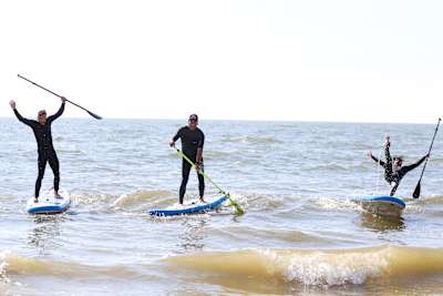 Champion Maximilian Götz (Uffenheim) returned to the ADAC GT Masters for the Madpanda Motorsport team in Zandvoort. He also tried his hand in more troubled waters: The 36-year-old and his team-mate at Emil Frey Racing, Albert Costa Balboa (31/E), were given an hour’s training session on a stand up paddleboard (SUP) by windsurf world champion Philip Köster. Armed with a board and paddle, Götz cut a fine figure on the North Sea coast, despite a few falls. After his adventure on the water, he found time to perfectly sketch the track layout at the dune circuit in the Zandvoort sand.