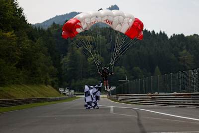 Austrian parachute World Cup winner and multiple junior world champion Sophie Grill literally “dropped” in to the ADAC GT Masters on Sunday. The 26-year-old from Salzburg appropriately landed on the start-finish straight. “As somebody from Salzburg, it is a special honour for me to be able to fly over and land on this circuit,” said a beaming Grill, who later handed the trophy over to Leyton Fourie and Tim Zimmermann on the podium.