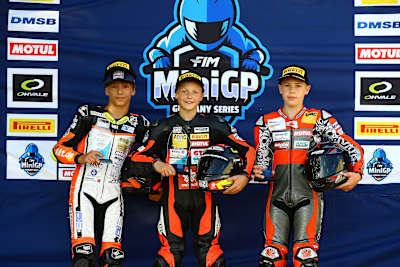 Fynn Kratochwil (1./1., Mühlhausen): „In den Freien Trainings am Freitag konnte ich mit meinem Team ein sehr gutes Motorrad für den Renntag hinstellen. Die Trainings und Qualifyings liefen gut. Mit der Pole Position war ich für die Rennen sehr gut vorbereitet. Im ersten Rennen hatte ich einen sehr guten Start und habe den ganzen Lauf geführt. In der Vorletzten Runde wurde ich dann überholt und bin dann knapp Zweiter geworden. Im Ziel kam es zu einer Kollision mit einem anderen Fahrer, wodurch wir beide zu Sturz kamen. Mein Motorrad wurde dabei sehr stark beschädigt. Mein Team um Dirk (Heidolf) hatte dann sehr viel zu tun, um mein Bike rechtzeitig zum Start des zweiten Rennens zu reparieren. Das haben sie dann knapp vorm Rennen hinbekommen. Ich war hochmotiviert und habe mir viel vorgenommen für den Lauf. Ich hatte einen guten Start, wurde aber überholt. Ich habe das Rennen dann taktisch gestaltet. Ich bin meist hinter dem Führenden geblieben, habe ihn zwischendurch Mal attackiert und überholt. Am Ende konnte das Rennen mit einer halben Sekunde Vorsprung gewinnen. Von dem Sturz abgesehen, verlief das Wochenende sehr gut. Ich habe noch zehn Punkte Rückstand in der Meisterschaft, aber ich und mein Team arbeiten daran diese aufzuholen.“