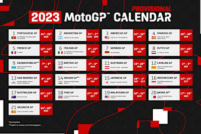 Das Warten hat ein Ende: Der MotoGP Kalender für 2023 wurde bekannt gegeben und bietet mehr Rennen und mehr Ländern als je zuvor. Die Stars der MotoGP werden bei 21 Rennen in 18 Ländern um den Titel antreten, erstmals auch in Kasachstan und Indien.