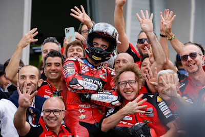 „Es war nicht einfach. Am Start habe ich alles versucht, um an der Spitze zu bleiben. Aber dann zogen Jorge und Franco vorbei. Ich dachte, sie pushen zu hart. So wie sie am Anfang attackiert haben, habe ich am Ende attackiert. Ich holte auf, erhöhte den Druck und in den letzten Runden merkte ich, dass Jorge Fehler machte. Nach seinem Sturz habe ich viel Tempo rausgenommen, denn es war sehr knifflig. Der Vorderreifen ist immer wieder weggerutscht. Ich bin überglücklich. Es ist mein vierter Sieg in Folge und mein erster hier auf dem Sachsenring“, sagt ein überglücklicher Bagnaia.