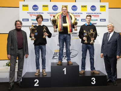 Kevin Köpcke nimmt Meistertrophäe in Empfang: ADAC Sportpräsident Tomczyk bei der boot Düsseldorf