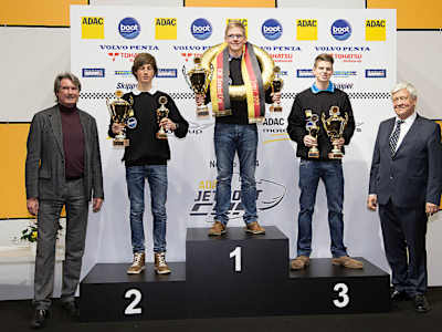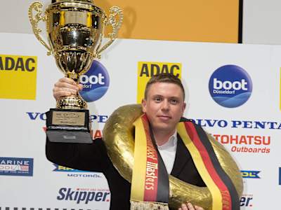 Kevin Köpcke nimmt Meistertrophäe in Empfang: ADAC Sportpräsident Tomczyk bei der boot Düsseldorf