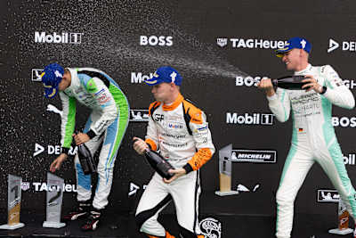 Den zweiten Rang sicherte sich Porsche-Junior Bastian Buus, der neben ten Voorde aus der ersten Reihe startete. Der 20 Jahre alte Däne aus dem Team Allied-Racing machte sich das Leben allerdings selbst schwer: Direkt nach dem Start verlor er mehrere Positionen und duellierte sich danach rundenlang mit dem starken Rookie Alexander Tauscher, der lange auf Rang zwei fuhr. „Das war erst der zweite stehende Start bei Regen in meiner Karriere. Ich bin nicht gut weggekommen, weil meine Hinterräder zu stark durchdrehten“, gab Buus zu. „Ich bin froh, dass ich es doch noch auf den zweiten Rang geschafft habe – die Meisterschaftspunkte kann ich gut gebrauchen.“