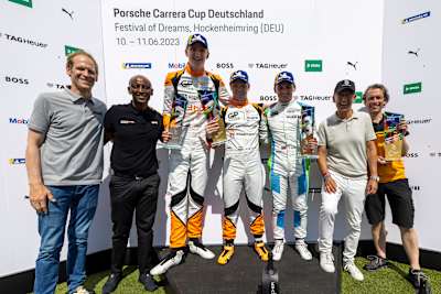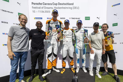 Das entscheidende Manöver gelang Larry ten Voorde schon wenige Meter nach dem Start. Im Sprint zur ersten Kurve beschleunigte der zweimalige Champion des Porsche Carrera Cup Deutschland seinen Teamkollegen Loek Hartog aus, der von der Pole-Position ins Rennen gegangen war. Auf den verbliebenen 17 Runden verteidigte ten Voorde überlegen die Führung. „Ich hatte noch das zurückliegende Rennen des Porsche Mobil 1 Supercup in Monaco im Hinterkopf, bei dem ich aus der Pole-Position heraus das Duell nach dem Start verlor und nur Zweiter wurde. Dieses Mal habe ich mich zu 100 Prozent auf den Start konzentriert – und der lief wirklich perfekt“, freute sich der 26-Jährige aus der Nähe von Enschede, der mit seinem ersten Saisonsieg die Tabellenführung im Porsche Carrera Cup Deutschland übernimmt.