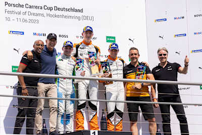 Deutlich ereignisreicher als für die beiden Erstplatzierten verlief das Rennen für Larry ten Voorde. Der Sieger des Samstagslaufs büßte kurz nach dem Start eine Position ein. Den australischen Rookie Harri Jones (Scherer Sport PHX) konnte er schon in der zweiten Runde wieder überholen. Anschließend war ten Voorde in ein packendes Duell mit seinem Landsmann Morris Schuring verwickelt. „Das war harte Arbeit. Aber die Zweikämpfe verliefen absolut fair und haben viel Spaß gemacht“, freute sich der zweimalige Champion des Porsche Carrera Cup Deutschland. Als sich Schuring beim Anbremsen der Kehre im Motodrom verschätzte und durchs Kiesbett rutschte, war der Weg zu Rang drei frei für Larry ten Voorde.