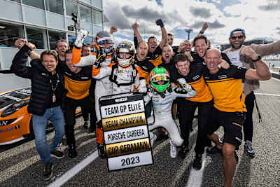 Im Duell mit der deutschen Mannschaft Allied-Racing baute GP Elite durch den Dreifach-Sieg seinen Vorsprung uneinholbar aus und sicherte sich zum ersten Mal den Team-Titel des Porsche Carrera Cup Deutschland. „Ich bin unheimlich stolz auf meine gesamte Crew. Wir haben hart dafür gearbeitet und alles gegeben“, fasste Torsten van Haasteren zusammen.